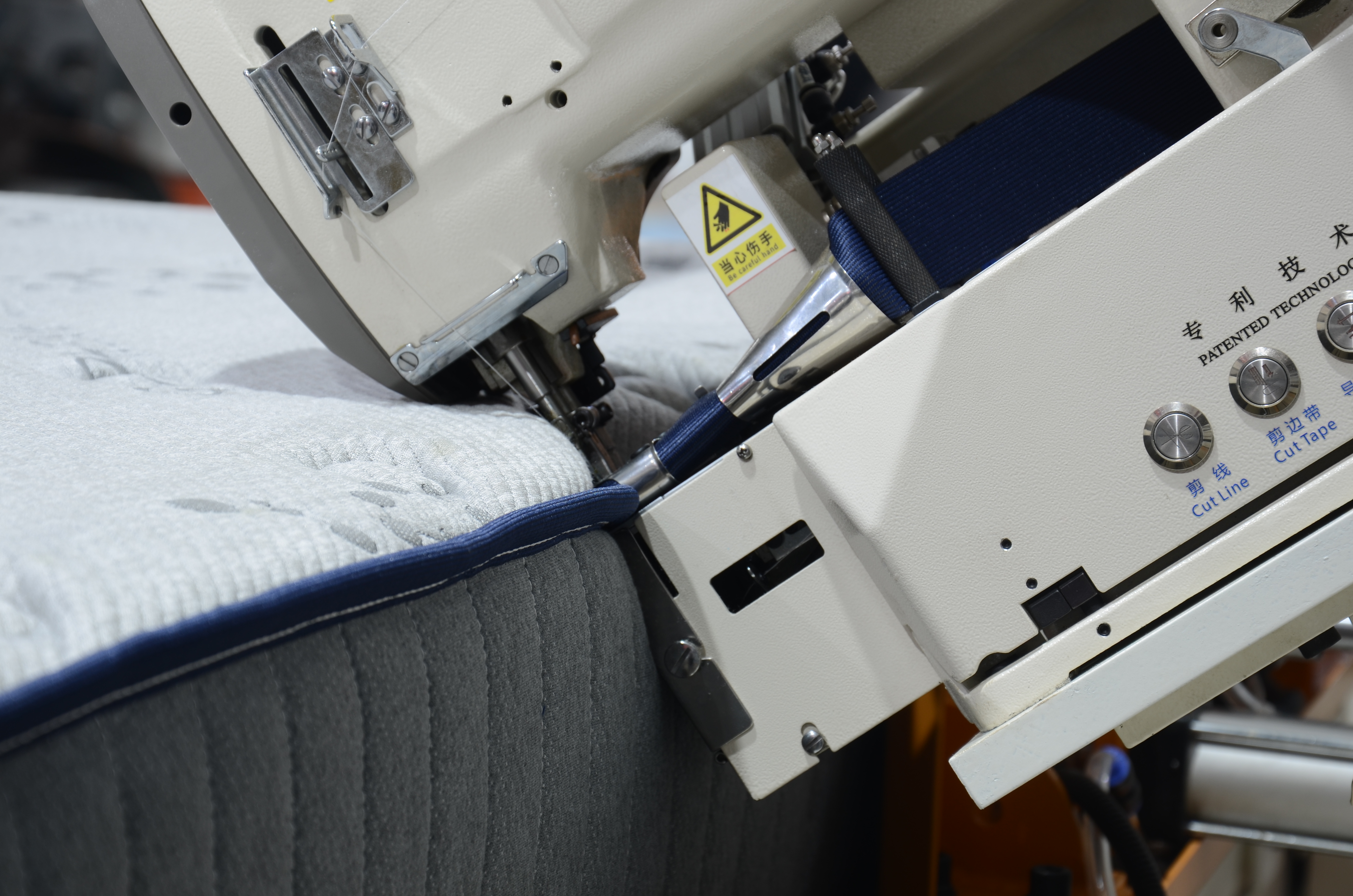Tape edge machines are used to sew the top and bottom panels of a mattress together with the side border. This is one of the most important finishing processes.